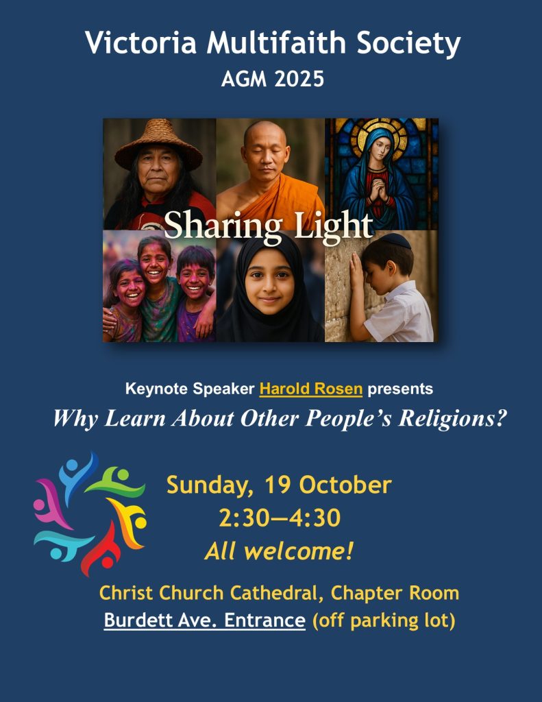 Our AGM was held Sunday, 19 October, at Christ Church Cathedral in a beautiful space called “the Chapter Room”, with 29 people attending. Interfaith educator Harold Rosen’s presentation “Why Learn about Other People’s Religions?” was filled with examples of the interconnection of our faiths and their positive effect on history and civilizations. Harold has compiled and edited “Sharing Light: a Multifaith Manual for BC Educators”, a wonderful resource freely available to all interested.